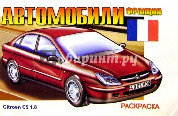 Раскраска для детей. На каждой странице - французский автомобиль. Указано его название, мощность, скорость.