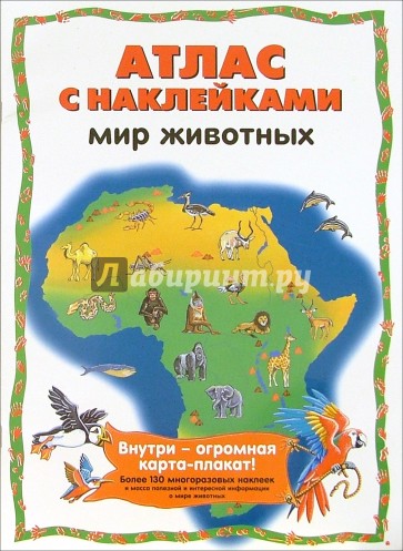 Н а вставке в центре атласа тебя ждут более 130 многоразовых цветных наклеек. Размести их на карте, и ты увидишь, как удивительно и многообразно животное царство. Дополнив карту, ты можешь повесить ее на стену - она украсит твою комнату и поможет тебе запомнить новые виды животных и места их обитания.