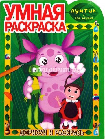 Раскраска с заданиями. Каждую картинку надо дорисовать по специальным пунктирным линиям и раскрасить. Картинки из мультфильма "Лунтик".