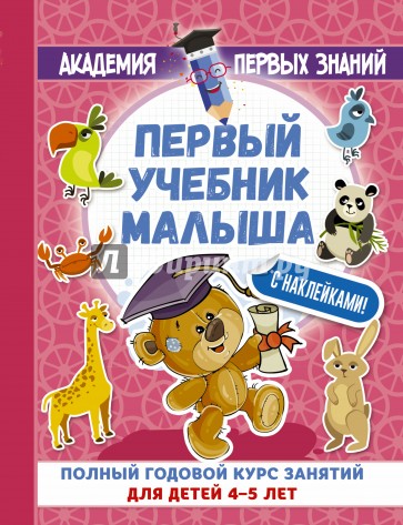 "Первый учебник малыша с наклейками. Полный годовой курс занятий для детей 4-5 лет" - развивающие пособие для обучения малышей в возрасте 4-5 лет, созданное по авторской методике А.С. Матвеевой. Выполняя увлекательные задания, ребёнок значительно расширит кругозор и разовьёт интеллект, узнает много новых слов, выучит алфавит, научится правильно произносить звуки, познакомится с понятиями формы, цвета, размера и количества предметов, научится писать цифры и считать до 10, рассказывать, объяснять, читать стихи наизусть. 64 наклейки превратят обучающие занятия в увлекательную игру.
