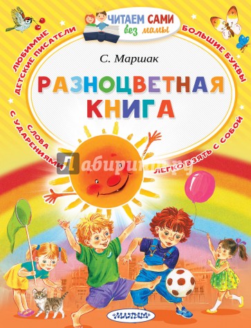 В "Разноцветную книгу" С. Маршака вошёл одноимённый цикл стихотворений, циклы "Круглый год" и "Что такое перед нами?". Эти знаменитые стихи познакомят детей с природой, окружающим миром и временами года, а потом мальчики и девочки отгадают загадки в стихах! Эту книгу юные читатели прочтут сами, ведь здесь крупный шрифт и все слова с ударениями.