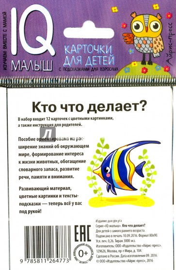 Набор "Кто что делает?" расширяет представления ребёнка об окружающей природе, формирует интерес к жизни животных, обогащает словарный запас, развивает речь, внимание, память. В набор входят 12 карточек с цветными картинками и инструкция для родителей.
