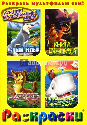 В раскраске использованы сюжеты из мультфильмов "Белый клык", "Книга Джунглей", "Кудряш. Маленький щенок", "Приключения китёнка Моби Дика".