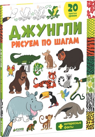 - чёткие пошаговые инструкции, как нарисовать хамелеона, тигра, лемура, мартышку, тукана и других обитателей джунглей.