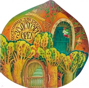 Интерактивная игровая книга в форме огромного ореха - это не просто книжка, а игрушечная гостиница "Золотой орех", придуманная Анастасией Орловой. Страницы - это комнаты и коридоры с дверцами, окошками, шкафами, кроватями, портретами на стенах и, конечно, многочисленными гостями - нарядными зелёными гусеницами. По сюжету стихотворения хозяйка гостиницы приглашает друзей на именины, орехового угощения вдоволь и гости веселятся вовсю. С каждой страницей гостиница становится всё меньше, всюду раздается радостное "хрум-хрум!", и прямо на глазах у читателей ореховые пол и потолок исчезают, а гости-гусеницы становятся всё круглее и веселее.