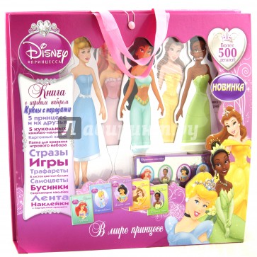 Книга с игровым набором: стильный чемоданчик, 5 фигурок принцесс и их друзей, 5 книжек-малышек, картонный замок, стразы, трафареты, самоцветы, бусинки, наклейки, а также папка для хранения игрового набора.