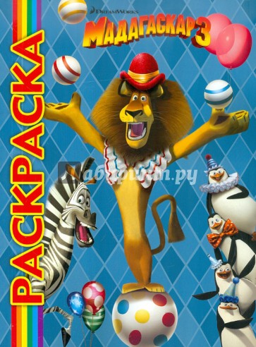 Раскраска по мотивам мультфильма "Мадагаскар 3". Каждая страница - картинка из мультфильма с комментариями.