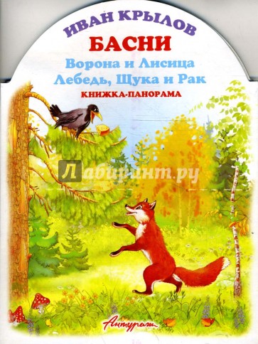 Картонные страницы. Каждый разворот - панорама. Отдельные части панорамки подвижны. Ребенок слушает басню и играет одновременно!